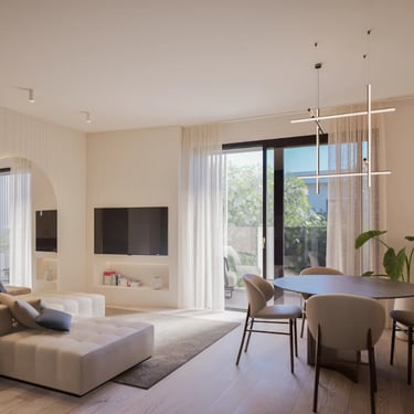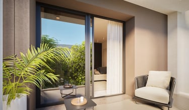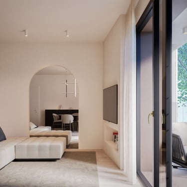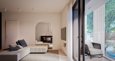 Ai piani superiori, gli appartamenti intermedi godono di terrazzi coperti e zone giorno vetrate, concepite per valorizzare il rapporto con l’esterno, garantendo al tempo stesso protezione, ombreggiamento e comfort termico.
